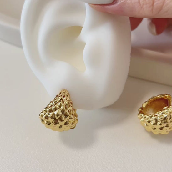 Command attention with our Textured Gold Teardrop Earrings, where bold texture fuses with lasting elegance. Expertly crafted from radiant 18k gold-plated metal, each earring presents a sculptural teardrop shape detailed with a striking scale-like pattern that gleams from every angle. The dynamic surface and polished finish emit a fierce, luxurious glow—ideal for making a powerful impression, whether worn alone or layered for maximum impact.